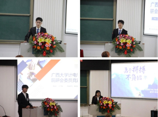 第二十届研究生会主席团。根据预备会议表决通过的选举办法,4位主席团成员候选人依次发表竞选演讲,阐述自己在学生工作中的心路历程和自我发展,真挚地表达了对研究生会的责任感、认同感和热爱,同时提出对研究生会未来工作的规划与展望。