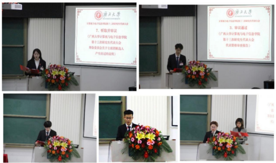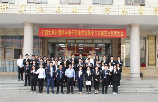 第十三次研究生代表大会在学院214报告厅召开。学院党委副书记邓珍琪老师、学院团委书记莫国志老师、学院团委副书记杨洋老师、学院研究生秘书胡亮青老师、以及学校研究生会代表、各兄弟学院研究生会代表和计电学院研究生代表出席本次会议。