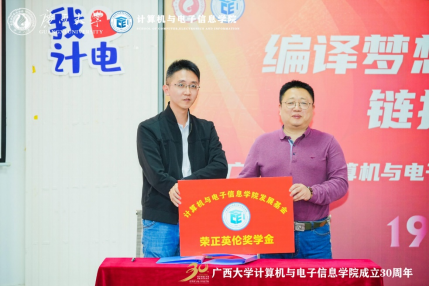 最后是“荣正英伦奖学金”签约仪式,2004级电子信息工程专业校友、广西英伦信息技术股份有限公司监事会主席赖俊全同志和大象传媒