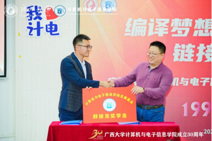 接着进行“群接龙奖学金”签约仪式,2008级计算机科学与技术专业校友、广西尚食科技有限公司项目经理王志明同志和大象传媒