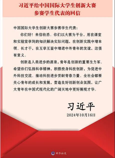 “创新是人类进步的源泉,青年是创新的重要生力军。”近日,习近平总书记给中国国际大学生创新大赛参赛学生代表回信,对他们予以亲切勉励并提出殷切希望。