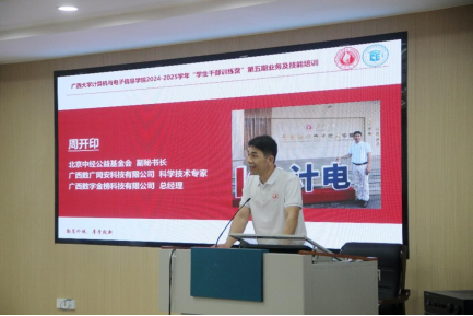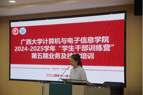 在214报告厅举办“学生干部训练营”第五期培训——业务及技能培训。此次培训邀请学院研究生科研秘书胡亮青老师、计算机网络1999级校友周开印学长、广西中公教育南宁分校讲师凌枝老师三位嘉宾进行经验分享。学院党委副书记邓珍琪老师、团委书记杨洋老师、辅导员张星月老师及多位校友代表出席,培训会由学院研究生会主席团成员史承悦同学主持。
