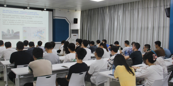 林海翔教授首先介绍了自己的一些主要经历、工作环境及其部分的研究成果。然后介绍了可再生能源和清洁交通的大背景,简述了多车充电时电网压力大、电动汽车的电池充电时间长、行驶距离短等现存的问题。由此提出了一个多学科决策支持体系和一个可行的解决方案:通过更换充电站的电池并使用备用的电动汽车电池作为存储系统来集成它们(G2V和V2G)。接下来,林海翔教授向同学们讲述了多学科决策支持体系的例子:研究未来分布式发电系统的建模和针对风光发电的随机波动设计多层分布式控制算法;利用过去三十多年的全球风光强度历史数据进行地理分布的风能和光伏发电的稳定性分析与优化;使用城市数字孪生模型对电动汽车使用以及充电和可调度容量建模和预测。随后,林海翔教授对预测模型的数学建模进行了详细解读。