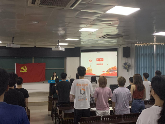 首先会议开始,全体党员同志起立,奏唱国歌。