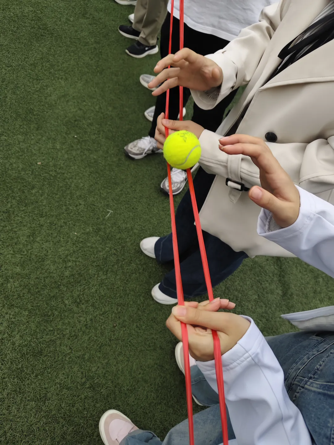 随后,“劈叉接力”、“坐地起身”、“信息中转站”、“爱的魔力转圈圈”等一系列趣味横生的小游戏逐一开展。在劈叉接力中,队员们依次劈叉接龙,脚尖脚跟紧密相连,拉伸与协作并行。一条条“人链”不断延伸,柔韧与团队精神在此刻完美展现,挑战身体极限。在坐地起身中,队员们围坐一圈,臂挽臂、背靠背,一声令下齐心发力。从坐地到一同站起,考验的是默契与配合,每一次成功起身都是团队的胜利。在信息中转站中,两根细绳,十颗网球,队员们小心翼翼接力传递。专注的眼神、稳定的配合,每一次顺利交接都凝聚着团队的智慧与耐心。在爱的魔力转圈圈中,队员们手拉手排成长龙,如旋涡般整齐转动。节奏一致、步伐统一,在旋转中考验协调与默契,场面充满动感与欢笑。