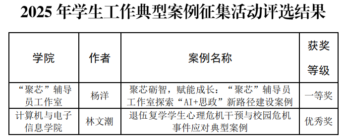 学生工作处在全校范围开展2025年学生工作典型案例征集活动。经个人申报、专家评审,共评选出获奖案例68项,其中:一等奖10项,二等奖15项,三等奖20项,优秀奖23项。